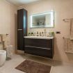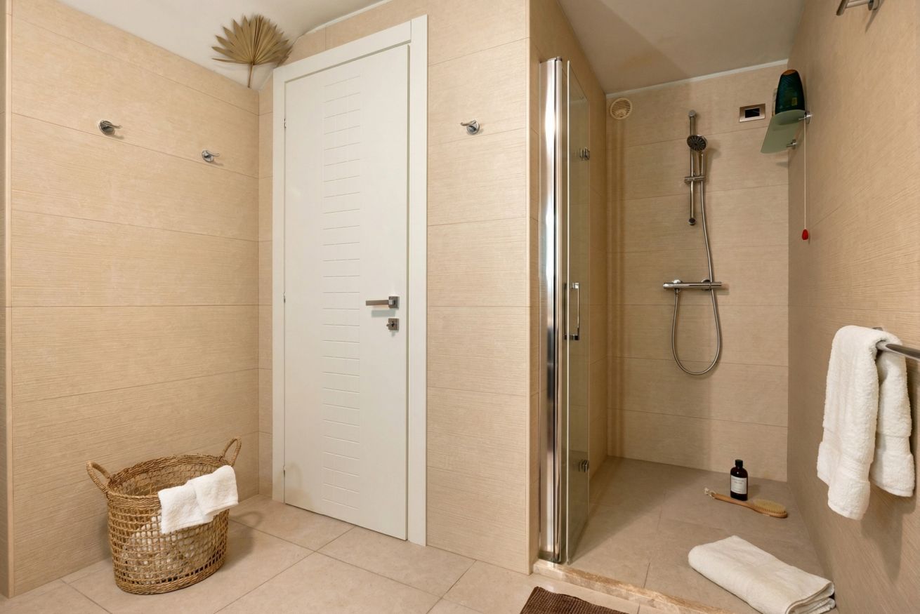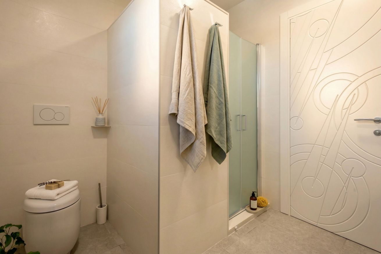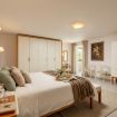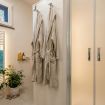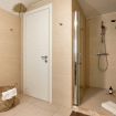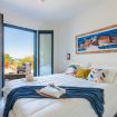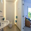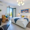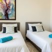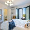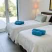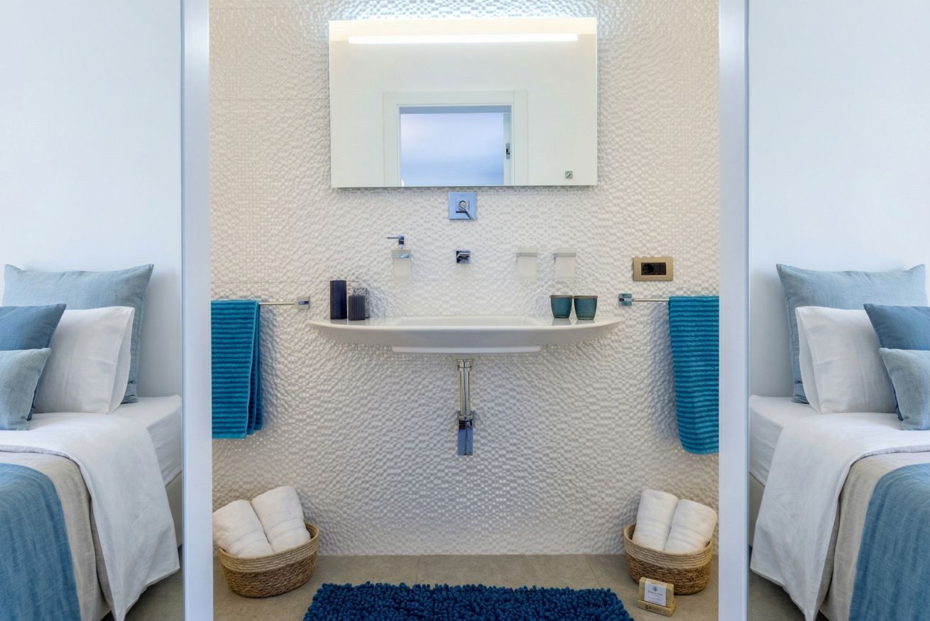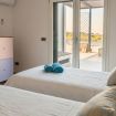The sleeping area of the villa consists of three double bedrooms, two of which are suites with a bathroom and one with a bathroom next door.