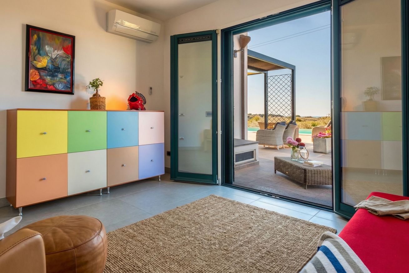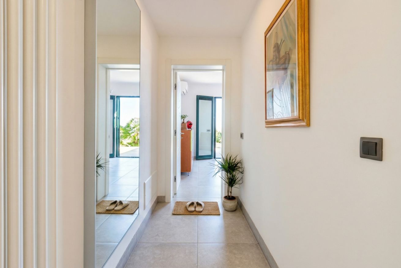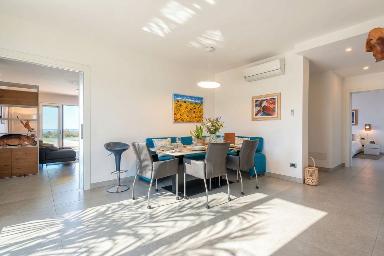 Entering the house we are greeted by a large and bright open space, with large panoramic windows, overlooking the landscape, the sea and the swimming pool for the exclusive use of the villa.