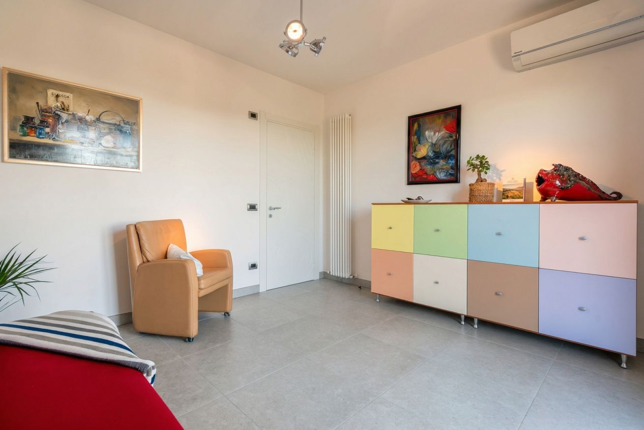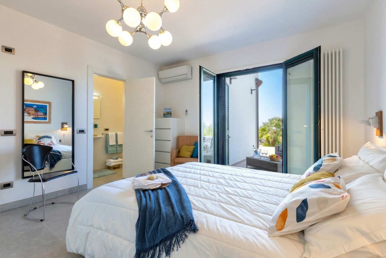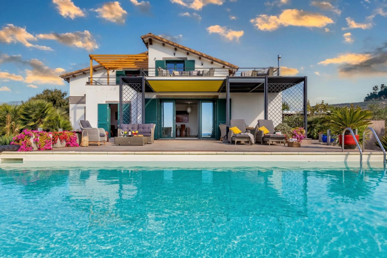 Entering the house we are greeted by a large and bright open space, with large panoramic windows, overlooking the landscape, the sea and the swimming pool for the exclusive use of the villa.