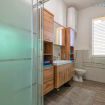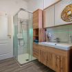 Sotto casa spiaggia attrezzata su scogliera con ombrelloni e sdraio.