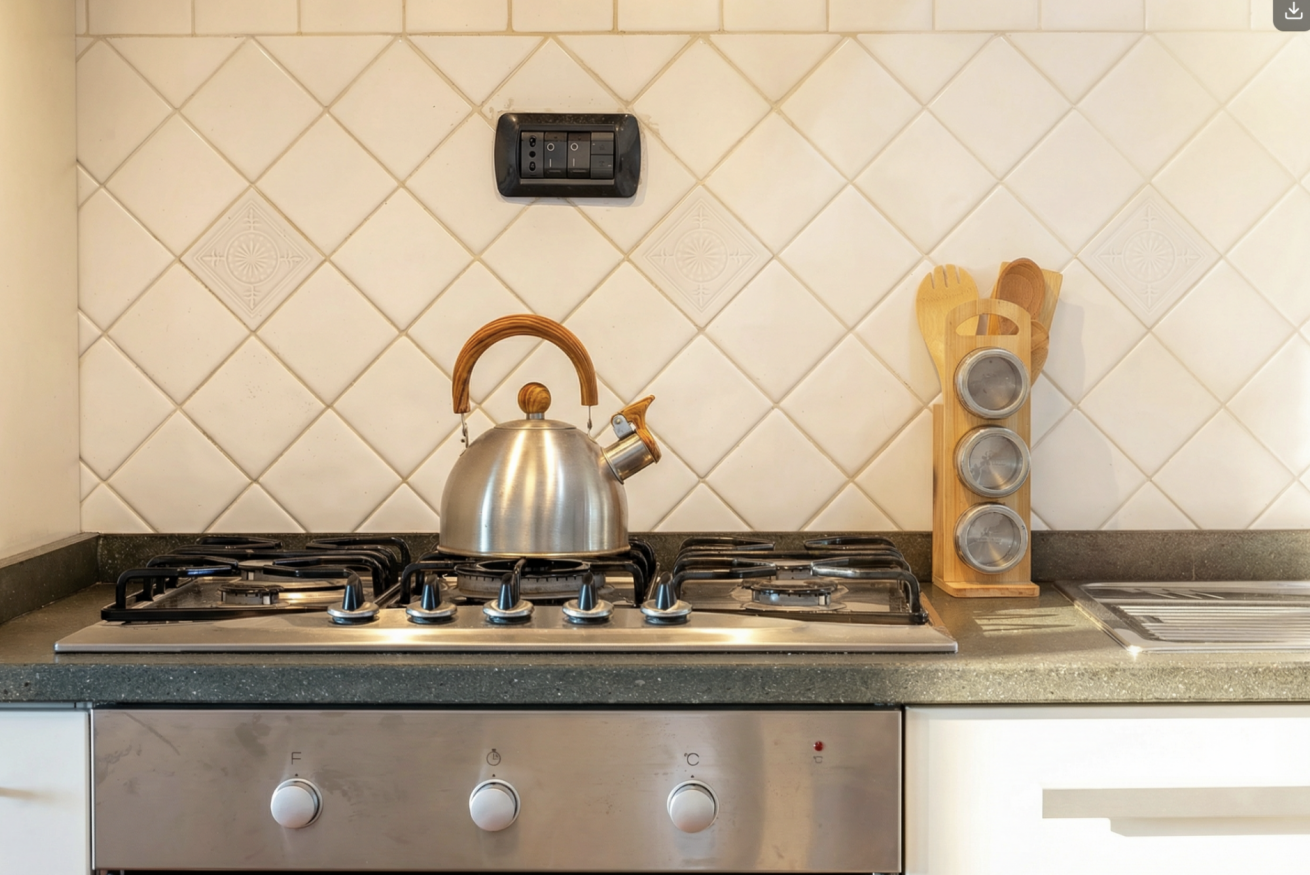 La cucina è completamente attrezzata, perfetta per preparare una cena da gustare all’aperto, mentre l’aria condizionata e il Wi-Fi rendono il soggiorno confortevole in ogni momento dell’anno.