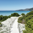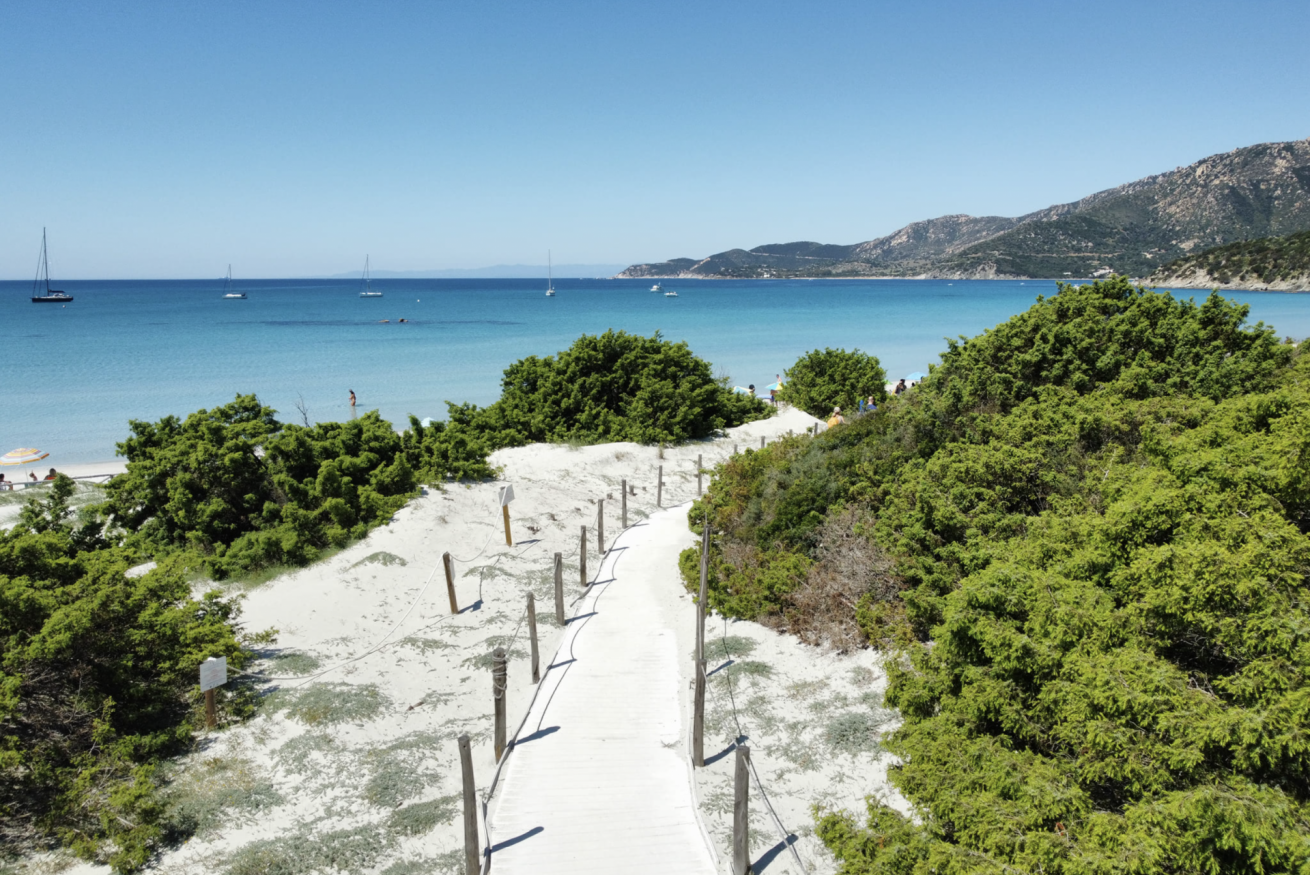 La Villa ha accesso diretto al mare e alla spiaggia, immersa all'interno di un ampio parco privato all’interno della Riviera dei Pini, confinante con magiche spiagge (Baia di Chia, famosa per le dune di sabbia bianca, per la trasparenza delle acque e il gioco di luci del fondale; Su Giudeu, Cala Cipolla, Porto Zafferanu, Capo Teulada: il suo sperone roccioso è il punto più meridionale dell'Isola e confluisce a picco sul mare.