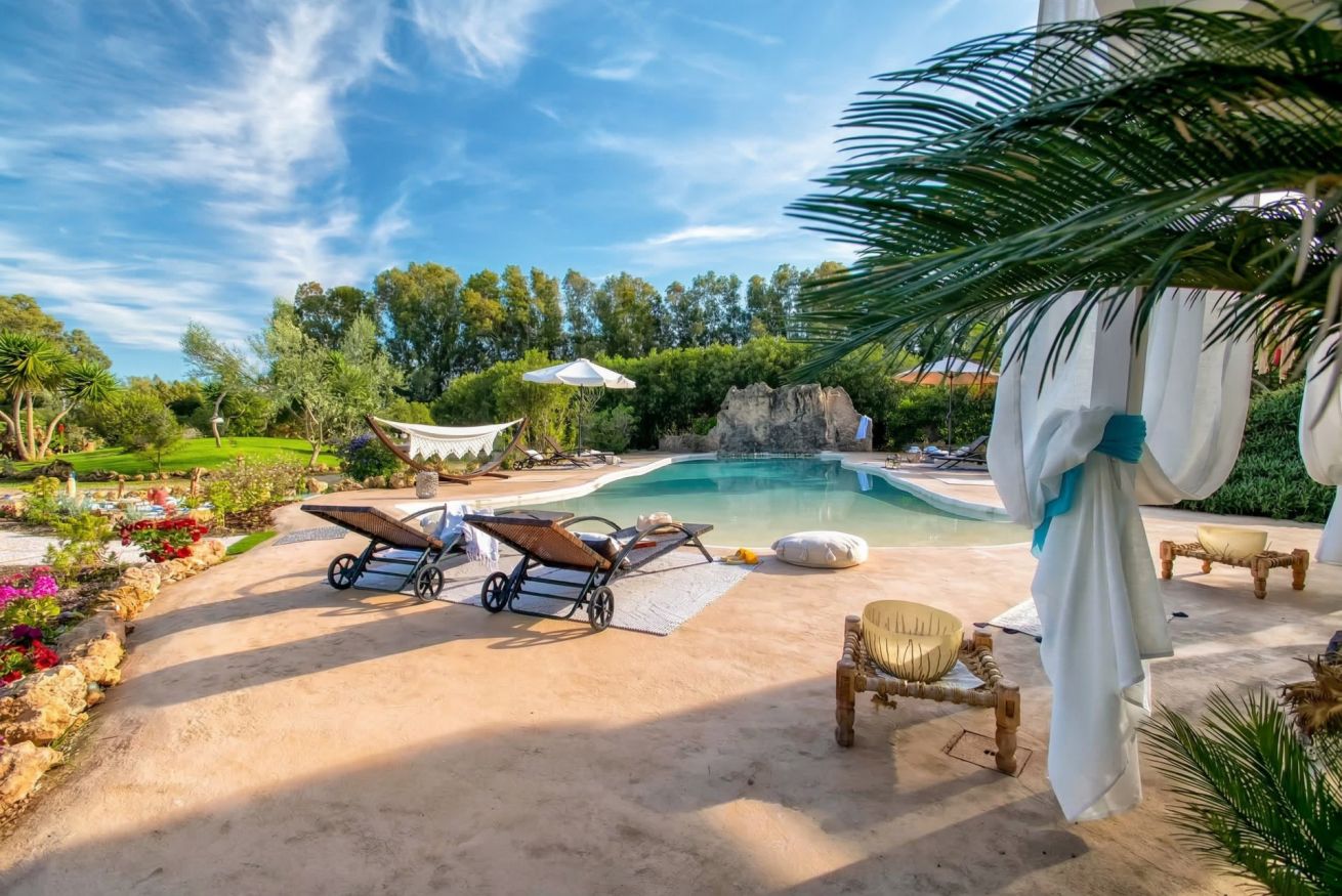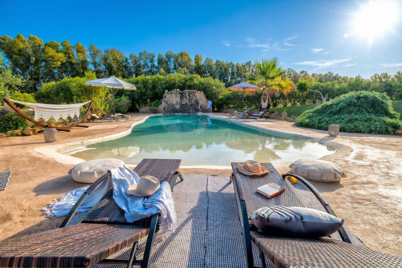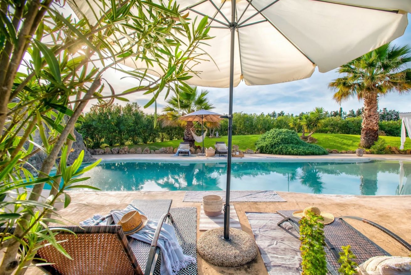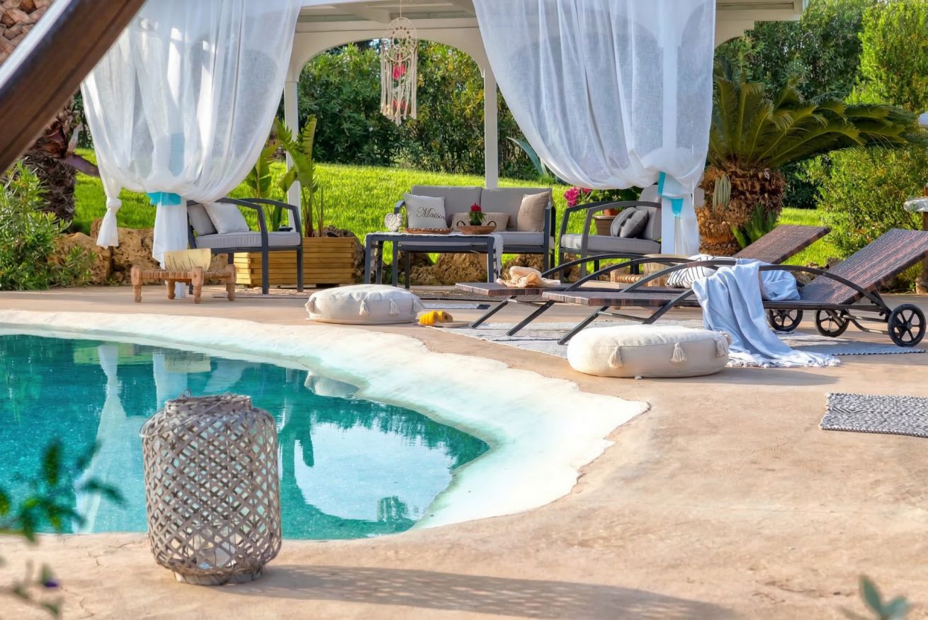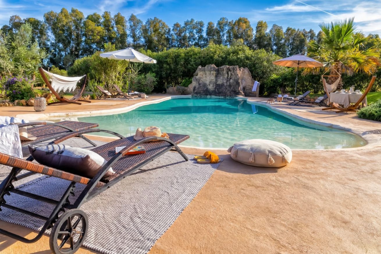 La villa dispone di una piscina effetto spiaggia a ridosso del grande gazebo bianco a uso completamente esclusivo.