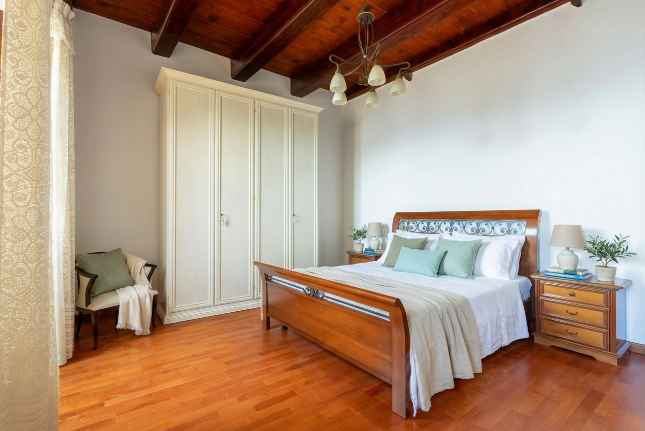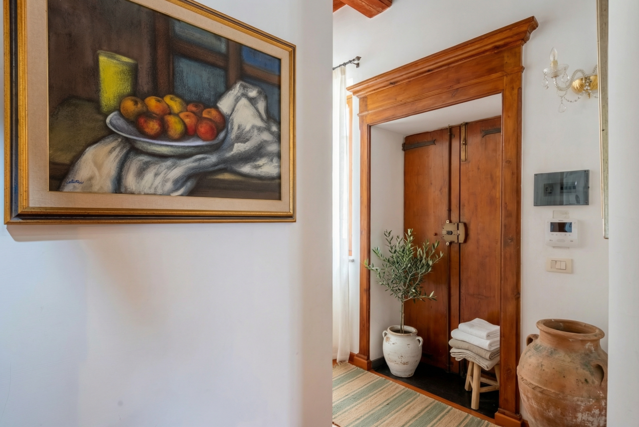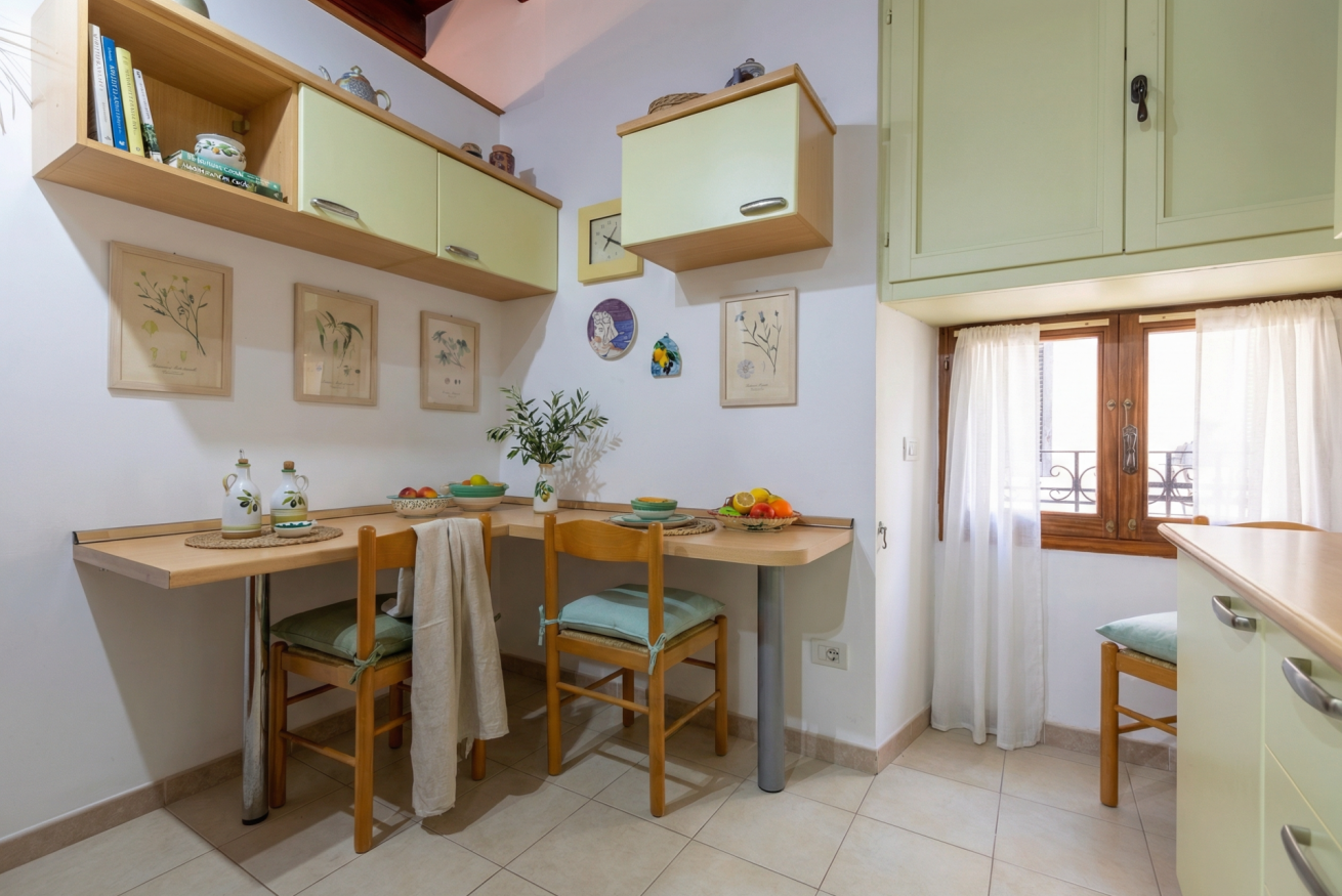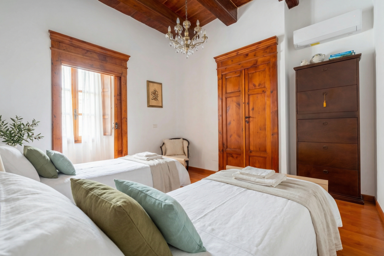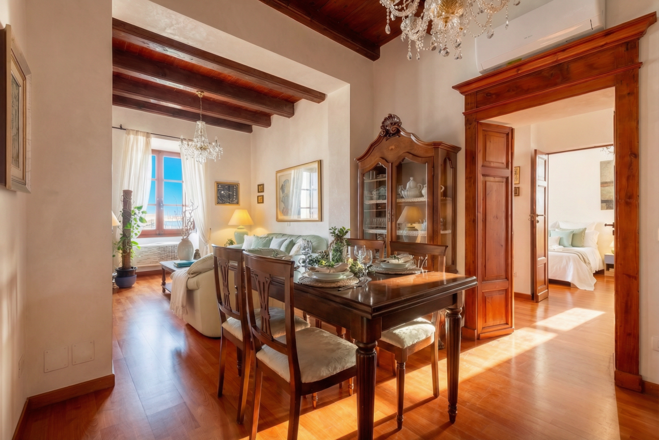 La casa conserva tutto il fascino delle antiche dimore algheresi: soffitti con travi in legno a vista, ambienti luminosi e arredi in legno massello che raccontano la storia della casa e della città, creando un’atmosfera calda, elegante e accogliente.