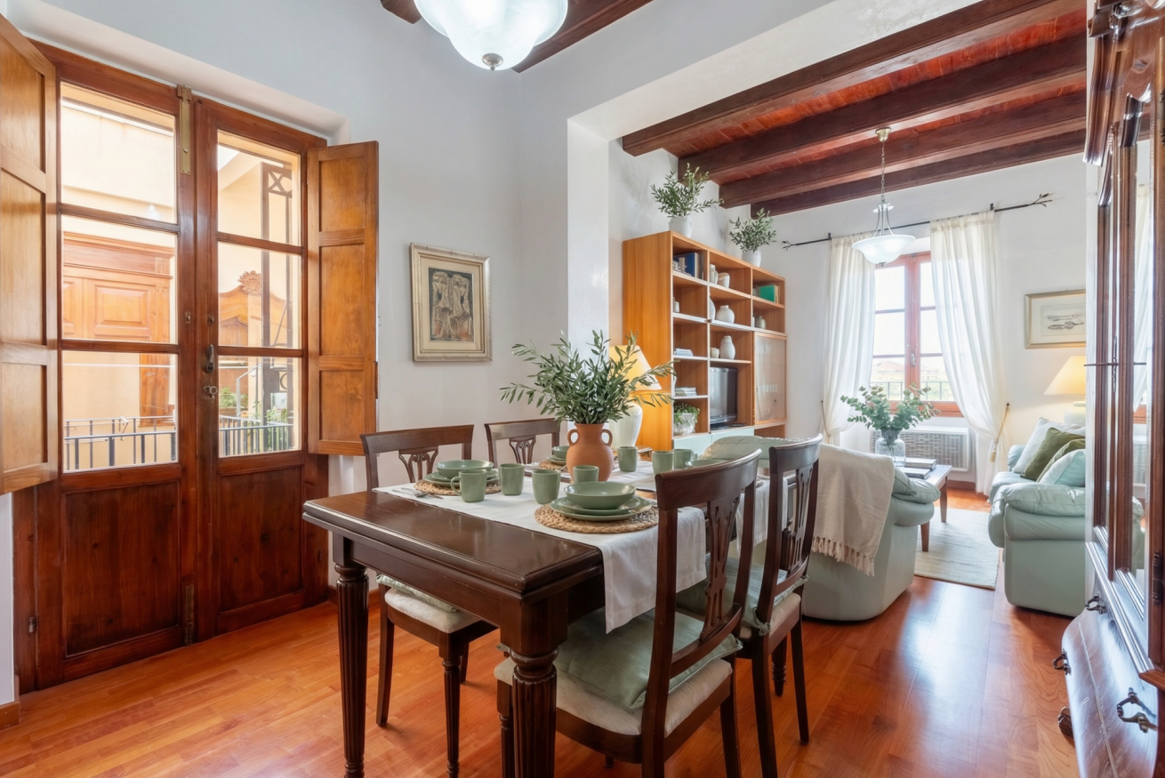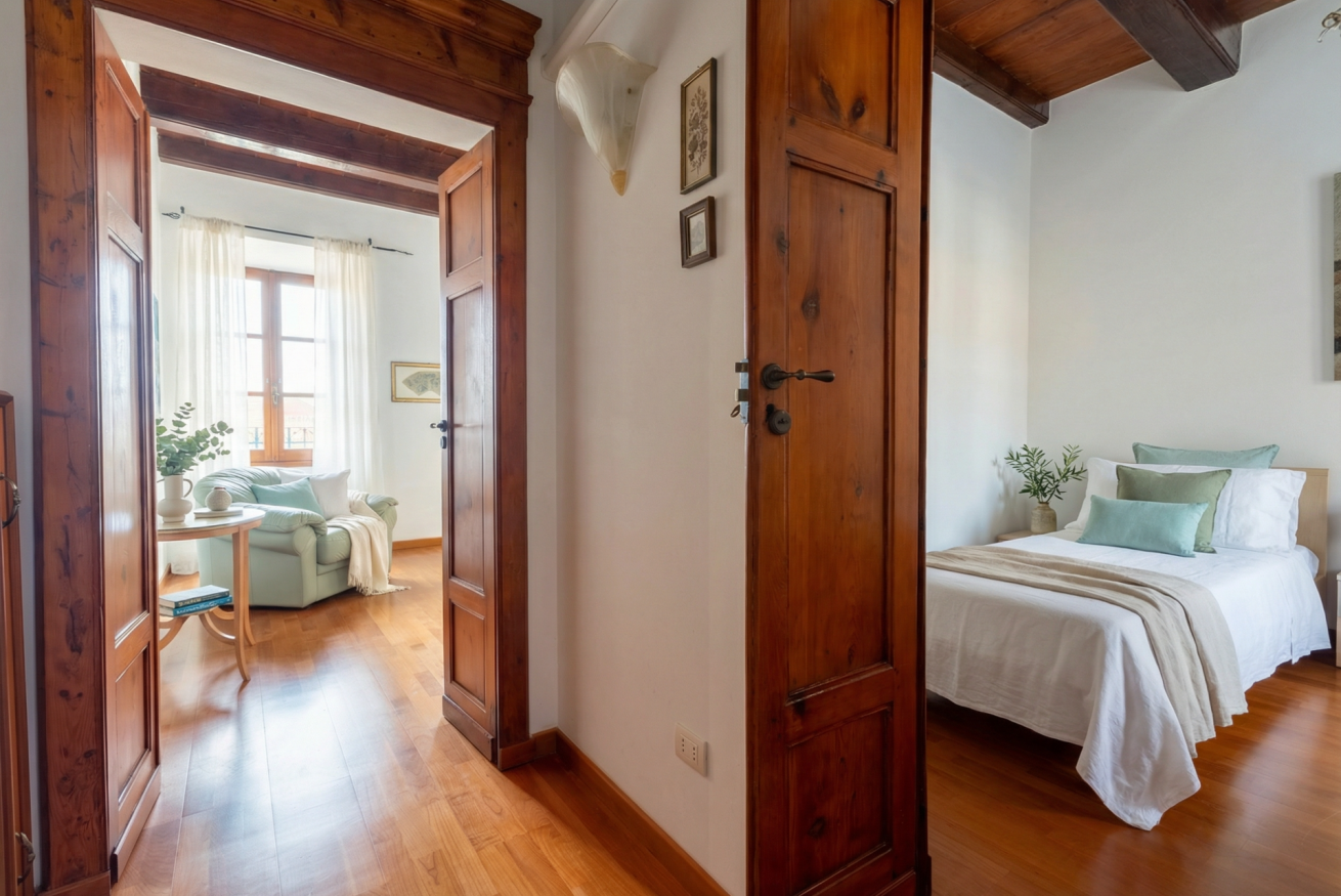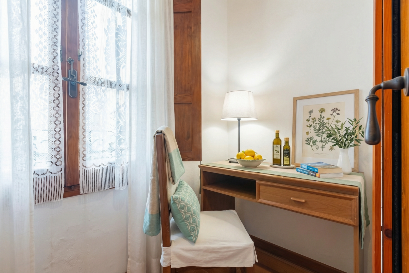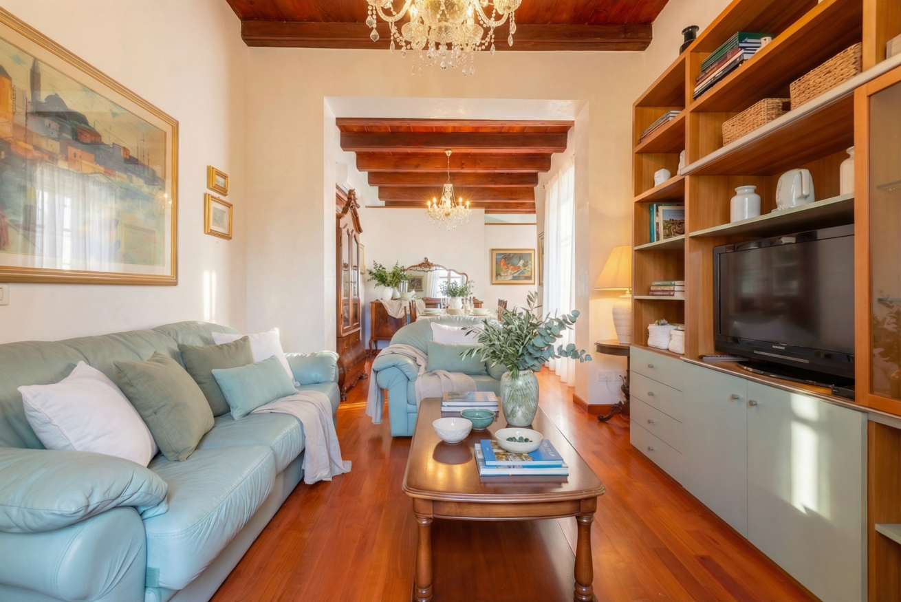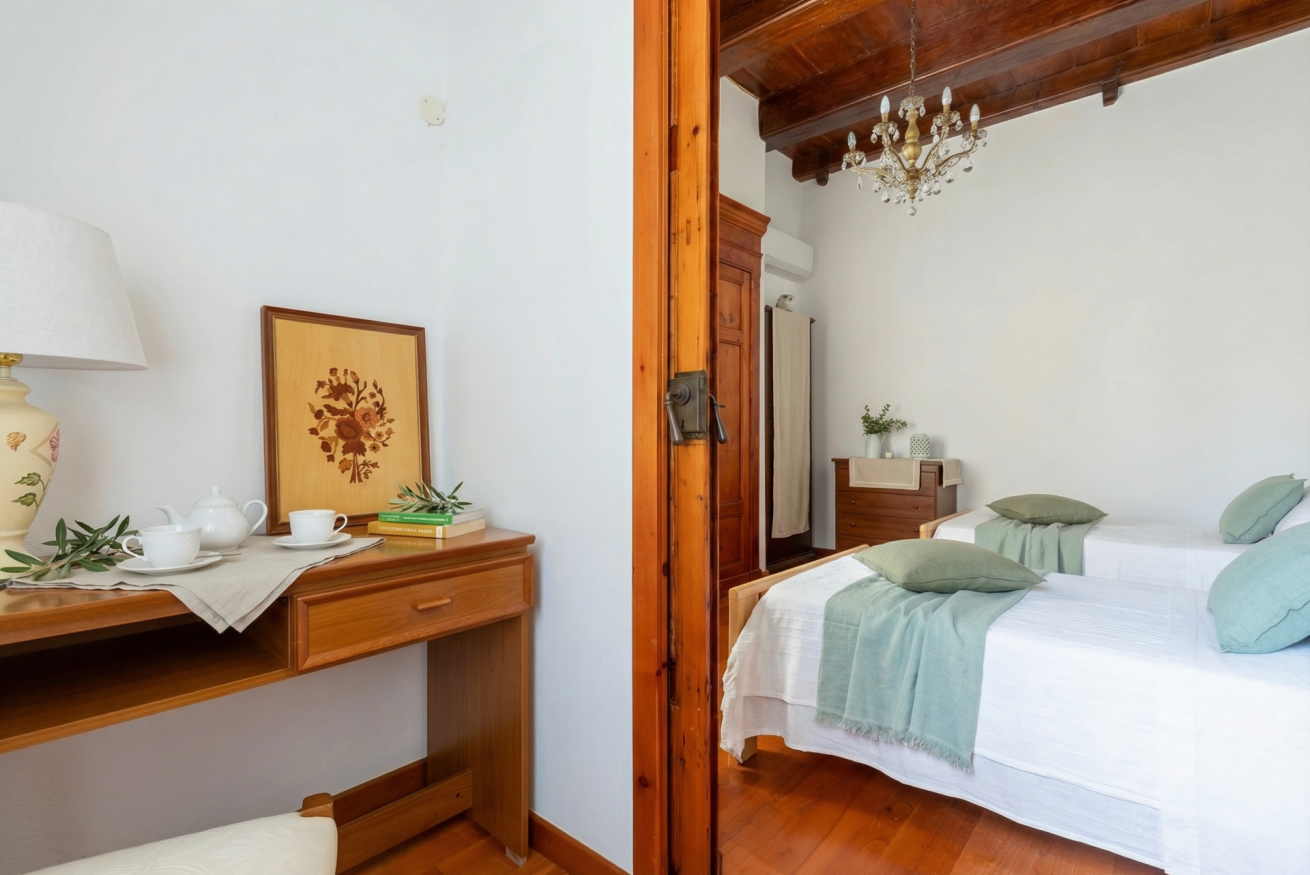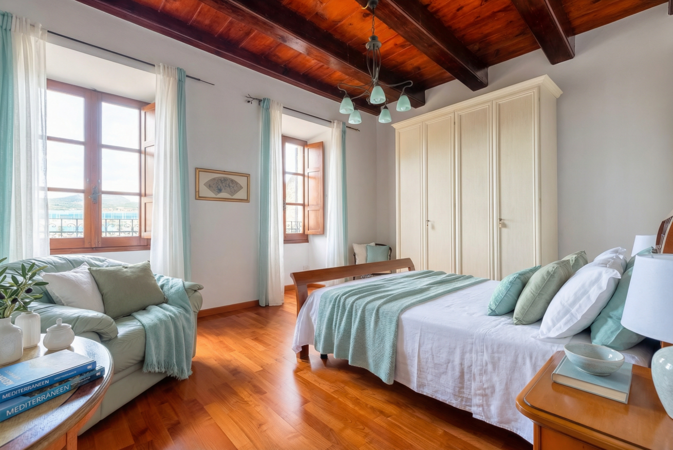 La casa conserva tutto il fascino delle antiche dimore algheresi: soffitti con travi in legno a vista, ambienti luminosi e arredi in legno massello che raccontano la storia della casa e della città, creando un’atmosfera calda, elegante e accogliente.