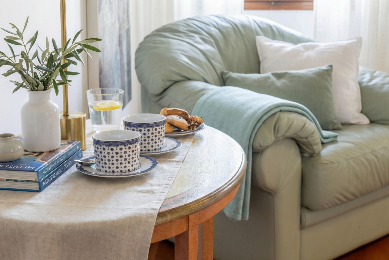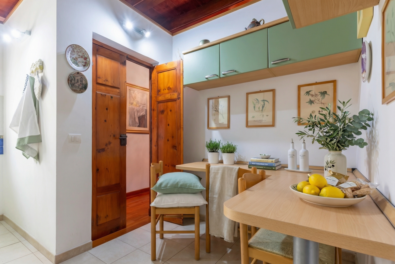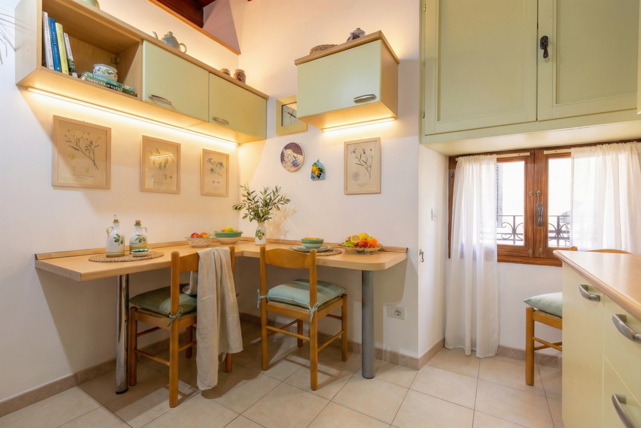 Il salotto, vero cuore della casa, si affaccia direttamente sul porto ed è il luogo ideale per rilassarsi, leggere o godersi una colazione in famiglia, ammirando il panorama. La cucina in stile classico, completamente attrezzata, unisce tradizione e funzionalità, perfetta per preparare piatti tipici dopo una giornata tra le vie storiche.
