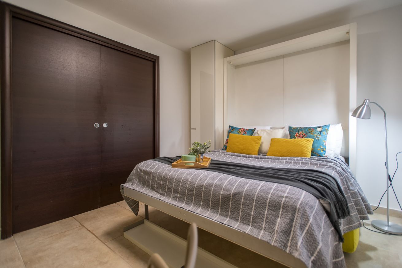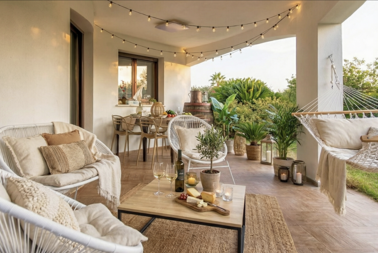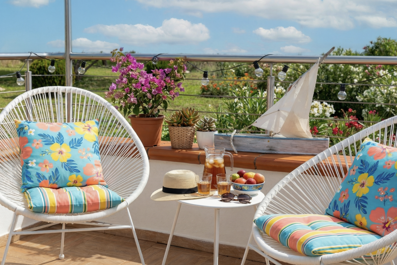 Dispone di: cucina attrezzata, soggiorno con divano letto singolo, due camere da letto matrimoniali di cui uno a scomparsa e un bagno ampio patio coperto di 40m² arredato con gusto.