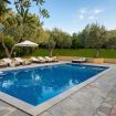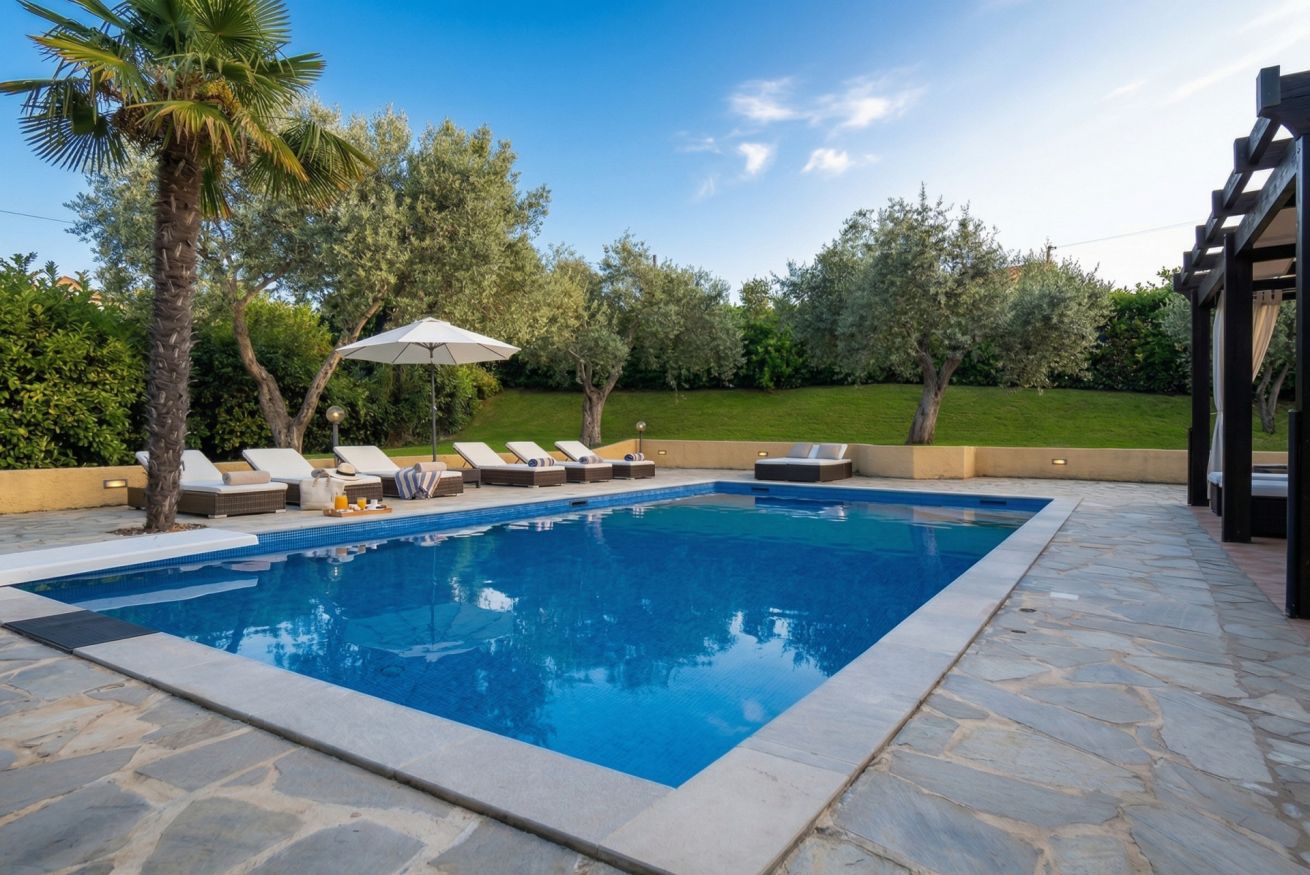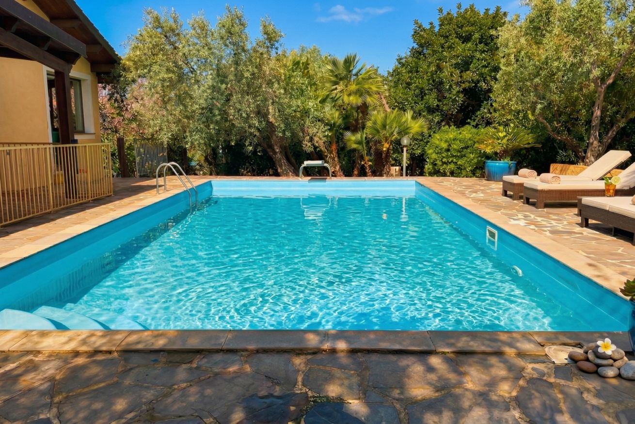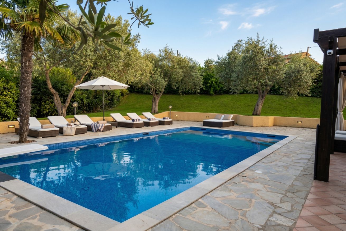 All’esterno, la piscina privata ad uso esclusivo (10 x 5 metri), con profondità da 90 cm a 2,4 metri e trampolino, è pensata per vivere la villa in ogni momento della giornata: relax, divertimento e totale libertà.