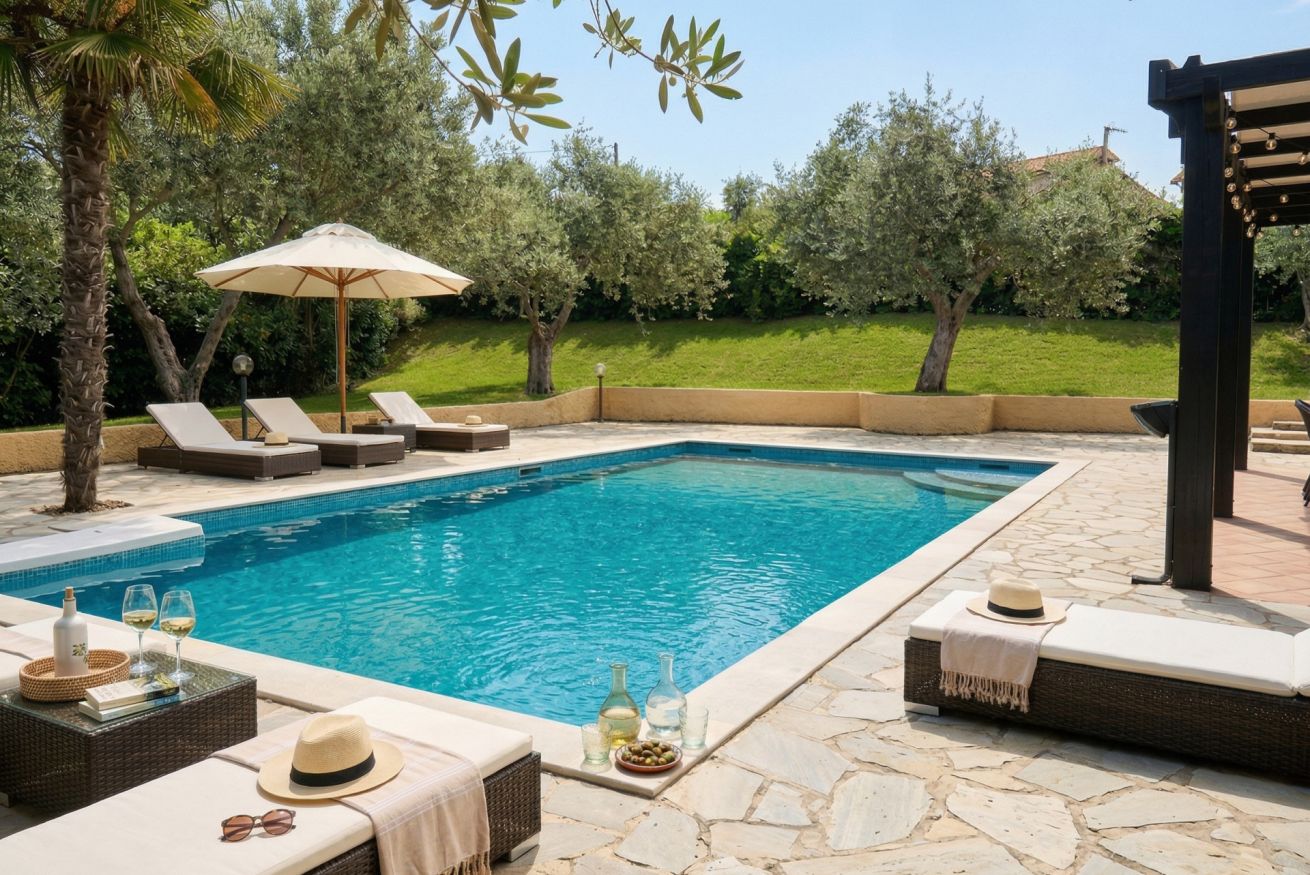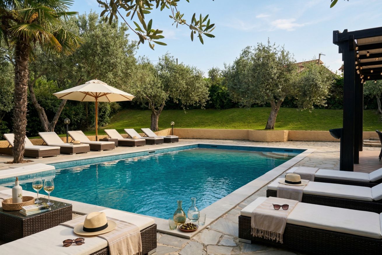 All’esterno, la piscina privata ad uso esclusivo (10 x 5 metri), con profondità da 90 cm a 2,4 metri e trampolino, è pensata per vivere la villa in ogni momento della giornata: relax, divertimento e totale libertà.