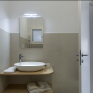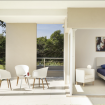 La villa dispone di quattro suites matrimoniali con grandi vetrate dominanti sul mare e con verande private delimitate solo da parapetti inox dalle linee essenziali i quali, come avviene nelle navi da crociera, consentono agli ospiti di percepire non solo con la vista ma anche con l’udito e l’olfatto la Natura in cui si è immersi, il sole che sorge ed il mare calmo che lo riflette, la brezza che agita le foglie, l’odore del sale e del mirto.