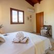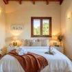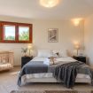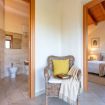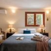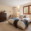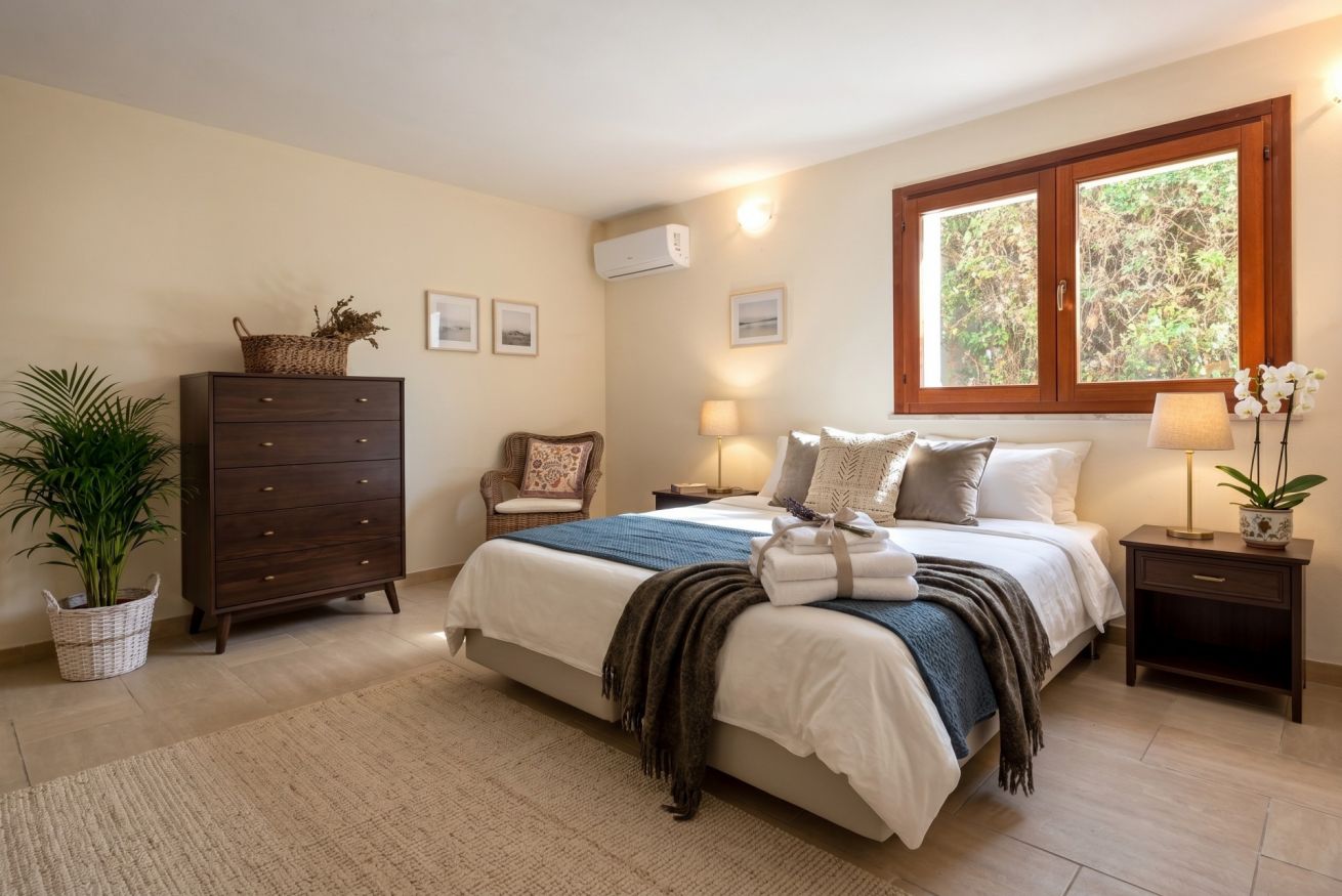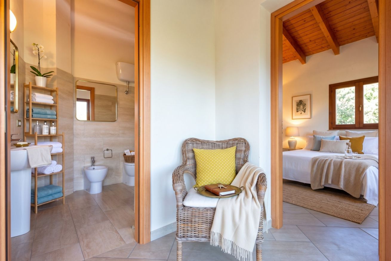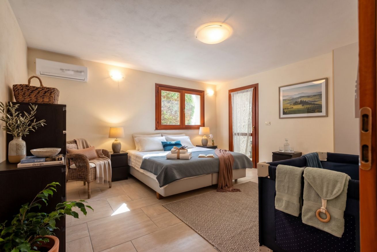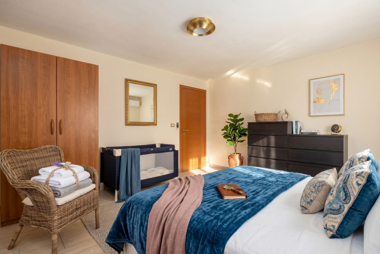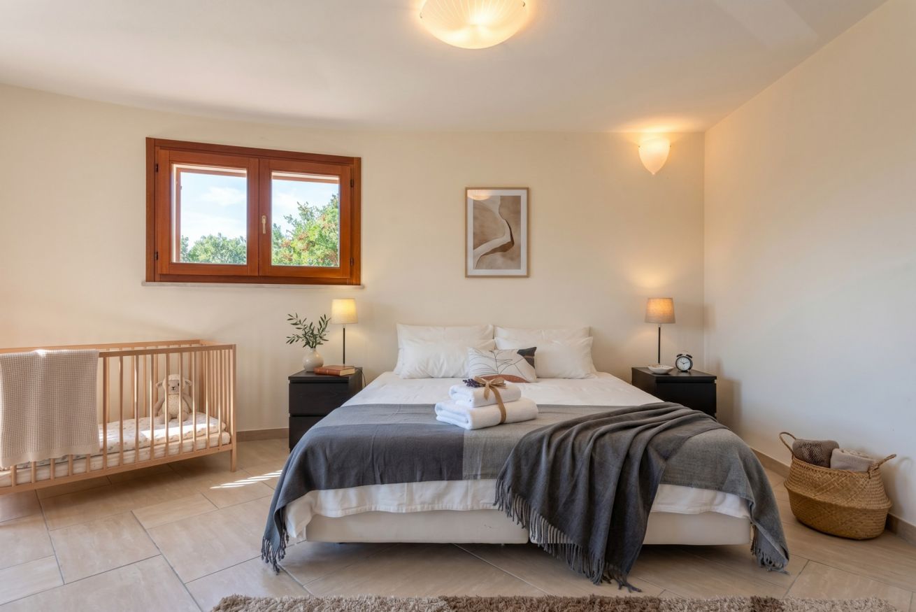 • Chambre 1 rez-de-chaussée - Chambre à coucher avec lit double, salle de bains privée avec douche et baignoire, deux lavabos, air conditionné, grande fenêtre donnant sur le jardin, lit bébé.